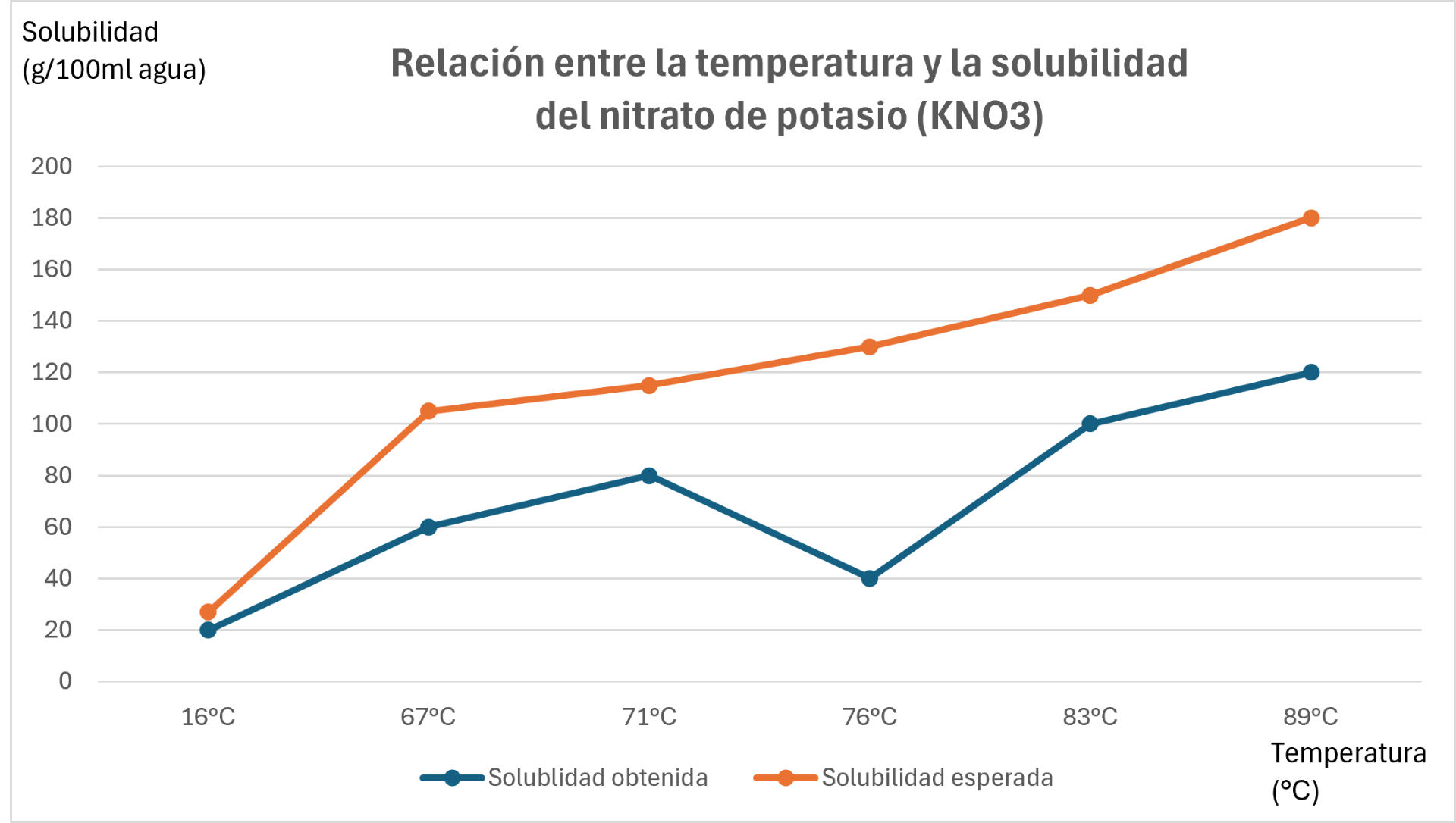 Este gráfico corresponde al experimento que realizamos en clases de química, durante este experimento se investigó cómo varía la solubilidad del nitrato de potasio (KNO₃) en función de la temperatura. Para ello, se preparó una solución con 5 ml de agua y diferentes masas de soluto, determinando la temperatura mínima a la cual el soluto se disolvía completamente. A partir de esos datos se calculó la solubilidad en gramos por 100 ml de agua. El gráfico obtenido muestra que, si bien la tendencia general coincide con la teoría, es decir, la solubilidad aumenta con la temperatura, existen diferencias importantes entre los valores esperados y los obtenidos experimentalmente.