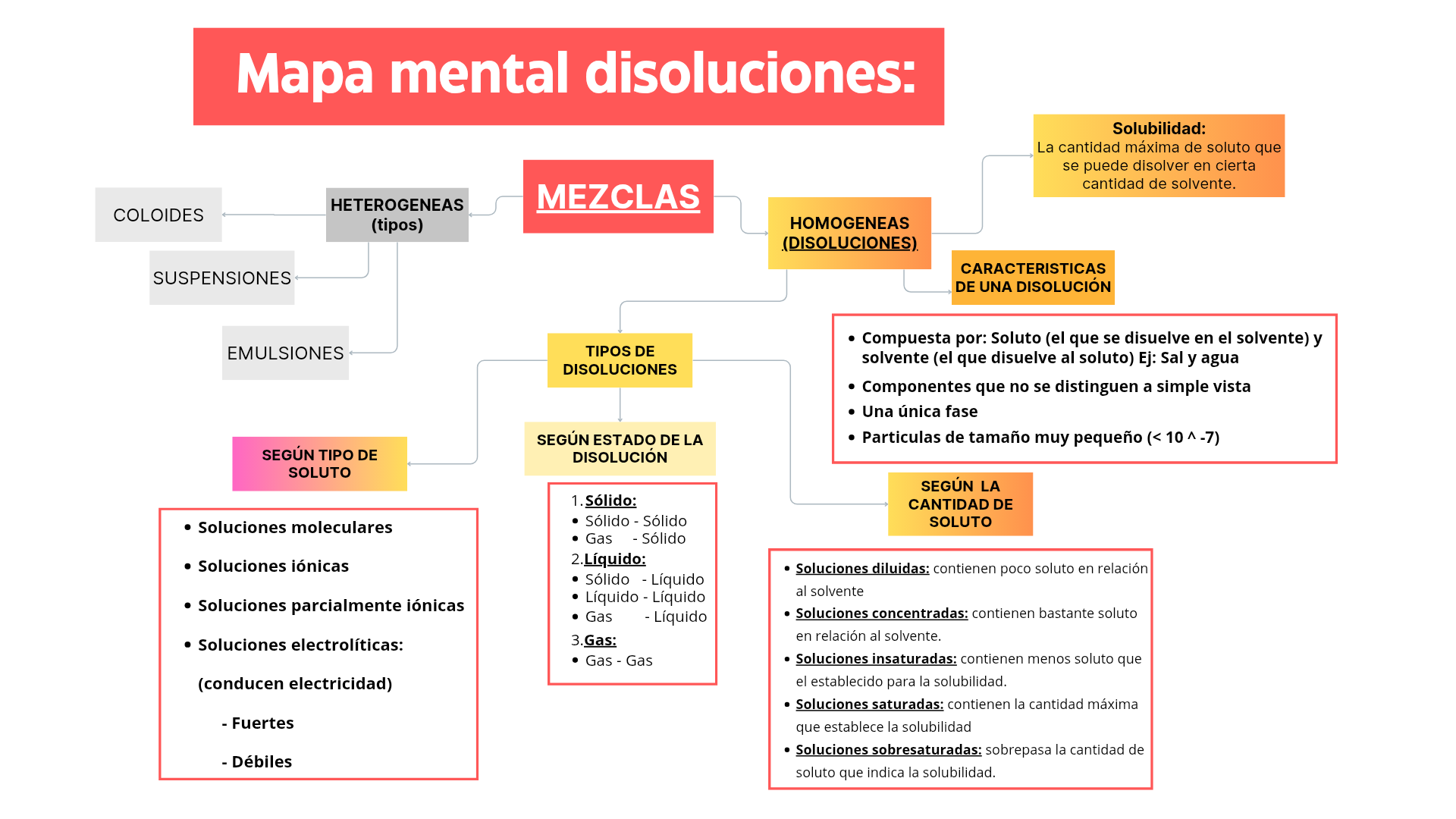 Una disolución es un tipo de mezcla homogénea en la cual no ocurre una reacción química entre el soluto y el solvente, ya que simplemente se reordenan. Estos coexisten y es difícil separarlos por los métodos físicos convencionales, existen diversos tipos de soluciones y normalmente ocurren entre sustancias con similar naturaleza química.